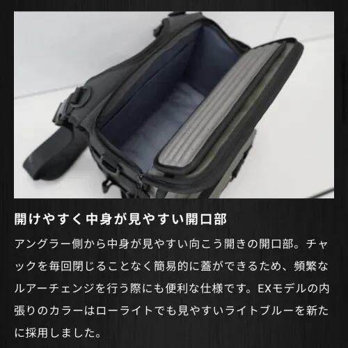 収納力とストレスフリーな使用感に定評のあるビッグベイトショルダーにEXモデルが登場。大幅なアップデートにより、使いやすさと耐久性が更に向上しました。ビッグベイトをはじめとした全長28cmまでの大型ルアーをダイレクトに収納できるポケットを備え、瞬時にルアーチェンジすることが可能。随所に散りばめられた工夫の中でも、ケース類の出し入れのしやすさには特にこだわりました。また、十人十色なスタイルに対応するためにカスタムの余白を持たせており、自分に合わせたセッティングで釣りに臨むことができます。バスアングラーだけでなくシーバスやエギングなど、様々なフィッシングジャンルにも対応します。