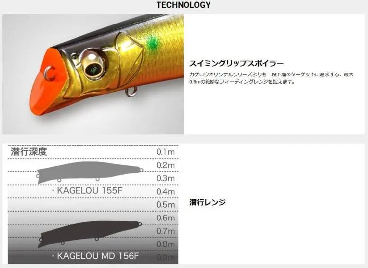 カゲロウ MD 156Fはマグナムサイズのカゲロウ・ミッドダイブモデル。 シャロー域や表層域において、ボラや落ちアユ、コノシロ等の大型ベイトが捕食される状況でボリューム感のあるハイアピールボディが絶大な効果を発揮。独自形態のリップスポイラーは、捕食レンジにシビアなモンスターを果敢に反応させるべく、このサイズで最もアジャスト率の高い最大0.8mの絶妙なフィーディングレンジを捉え、オリジナルのカゲロウよりも一段下層の攻略を可能としています。また、強化したダイビング・スタビリティによって、荒れた波風や潮流による水面からの飛び出しを完全に抑え、外洋の磯場やサーフなどラフな環境にも対応。カゲロウ MD 156Fに搭載した重心瞬間移動システムLBOⅡ(PAT.)は、カゲロウMD 125Fと比較してウエイト本体重量を2倍以上も増加。圧倒的質量を持つベアリング内蔵ウエイトがキャスト時に強力な推進ベクトルを発生させ、従来の同サイズルアーの平均的飛距離を格段に凌駕する、超・長距離飛行を実現。リールハンドルに手を掛けた瞬間に、即座にロールアクションが立ち上がる稀代のレスポンシビリティが、圧倒的に攻撃領域を拡大。竿抜けエリアのモンスターに迫ります。