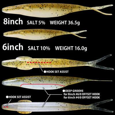 ソルト含有量は8inch=5%、6inch=10%のマテリアルは、引張強度が高められた針持ちの良くワームの裂けや破損を軽減してくれます。